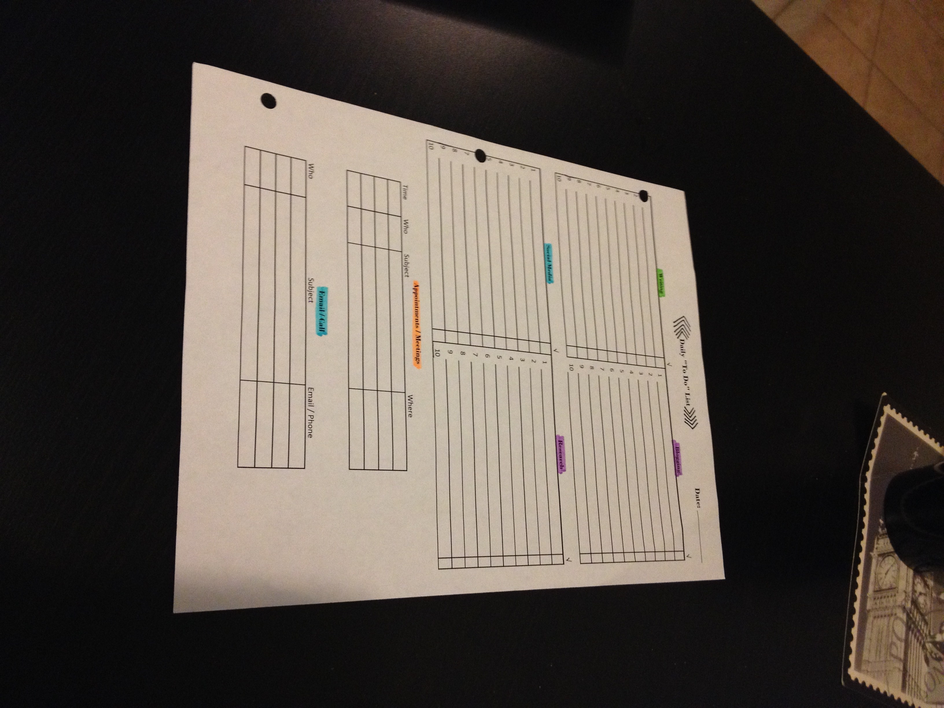 Here is a breakdown of what my Daily To-Do List paper has one it. It is broken down into 6 sections.