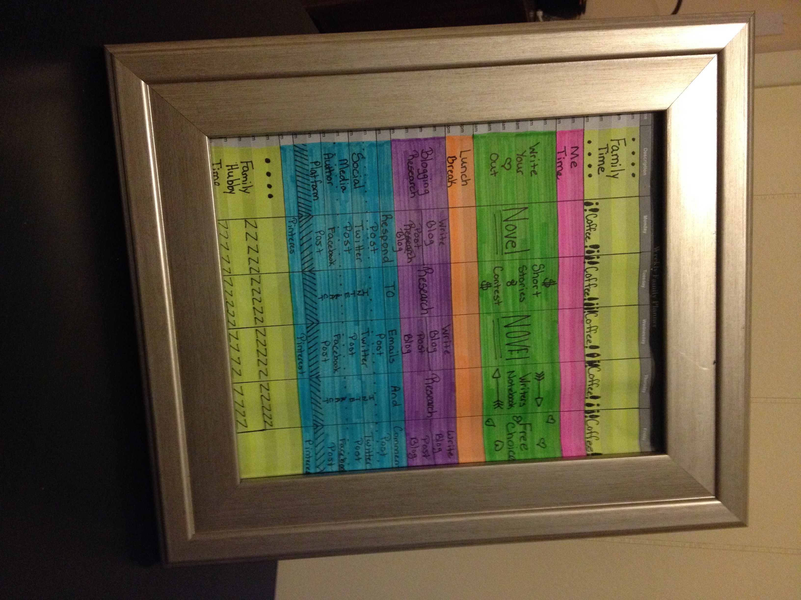 Next I took my finished basic weekly schedule and placed it into a picture frame. Why you ask? Not because I thought it was a work of art lol but because this way, I will have my basic schedule (only having to print it and fill it out once) under glass so that I can take a fine tip dry erase marker and fill in those tasks that only happen now and then or appointments that pop up but are not a regular thing. You know, saving paper = saving the planet…. small steps at being “green”. Or I’m just a cheap skate and want to save on printer paper and ink. I’ll let you decide which one is the true statement 😉