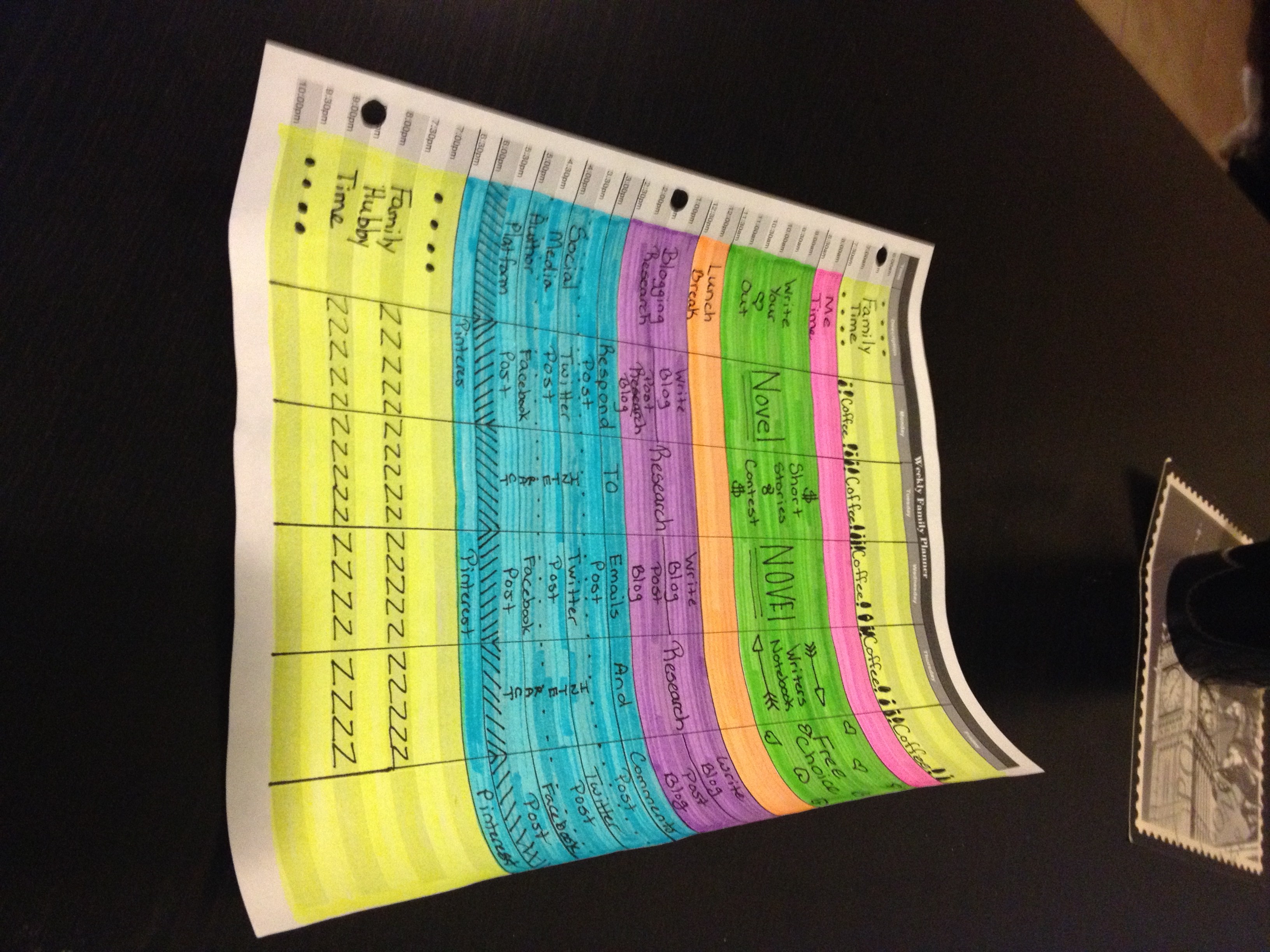 This is a picture of my weekly writers schedule. I created a basic hourly schedule in Microsoft Office and then printed it out. I filled in all the necessary tasks that I would need to perform each day and then color blocked the time I’ve designated to complete them so I can visually see how much time each task takes. I then added some embellishments to make the schedule more visually appealing to me. You don’t have to do that but I recommend it because, honestly, who wants to look at a boring piece of paper.